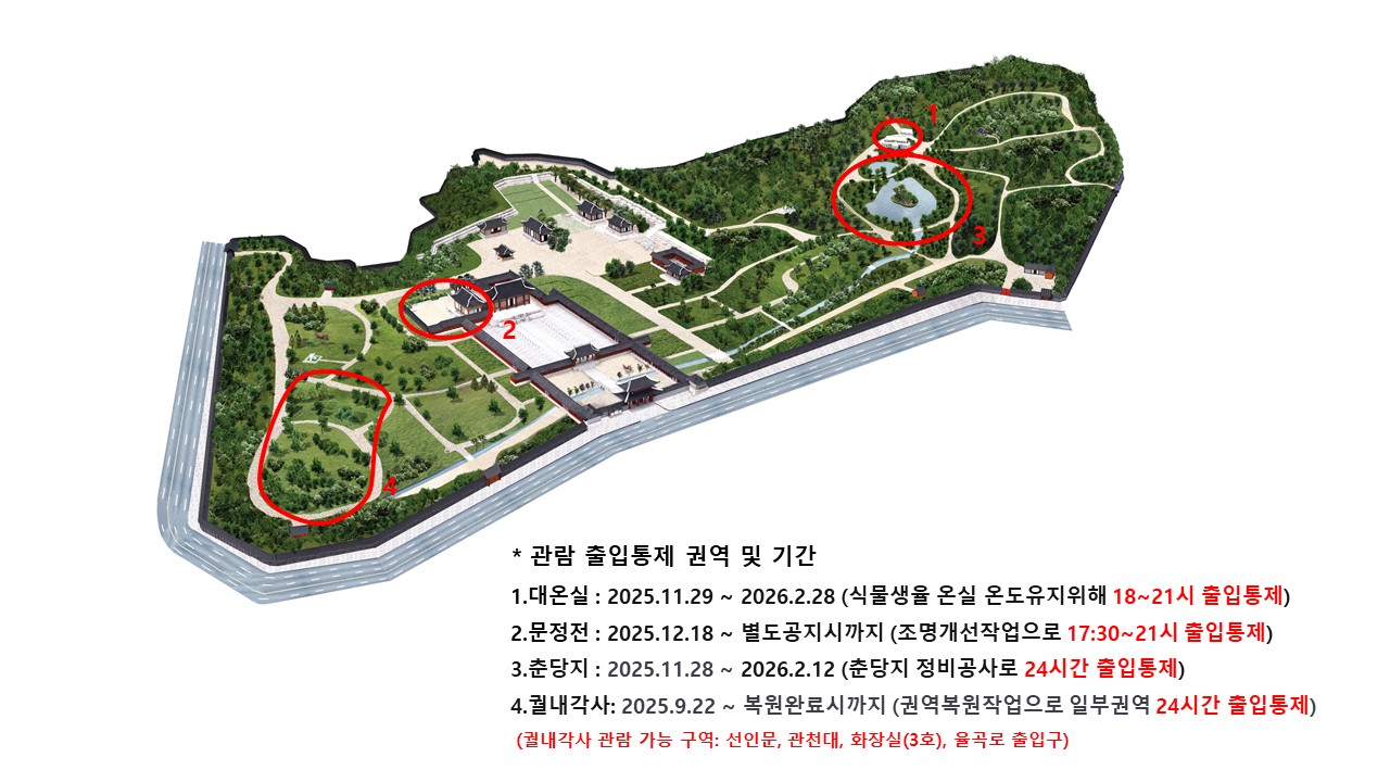 - 출입통제 사유 : 춘당지 정비 공사로 인하여 관람 제한