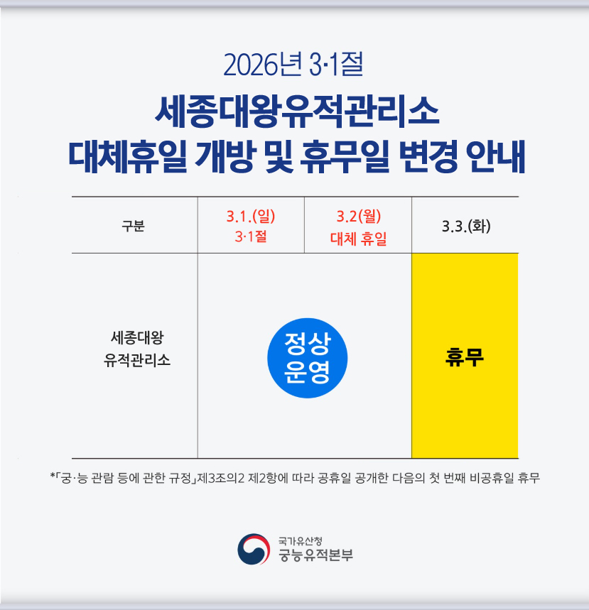 📢세종대왕유적관리소 3월 대체휴일 개방 및 휴관일 변경 안내 📅3월 1일(일) ~ 3월 2일(월) 정상 운영 📅3월 3일(화) 휴관일 ❗3월 대체휴일에 관람 계획 있으신 분들께서는 참고 하시기 바랍니다.